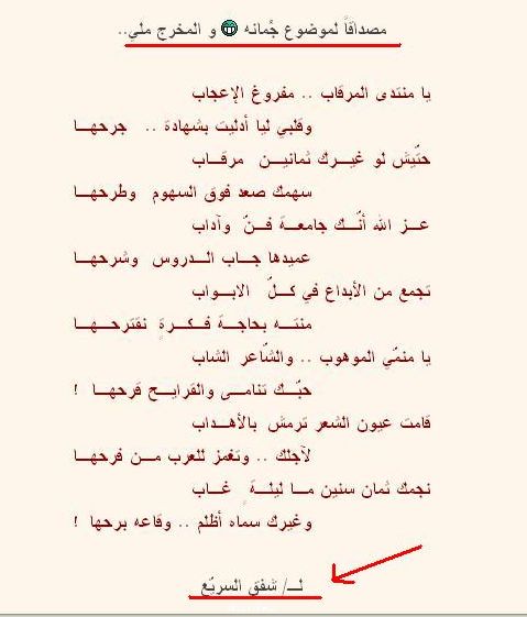 ياسلام ياسلام ياحلو هالمختصرة يا رياجيل حلواه كايفه عز الله هيضتني يا ناصر اي والله حيّ قاف ٍ يستوي لي واستوي له بالمضامين الثمينه والمبادي يوم ناصر سجّله وأخلى سبيله شعّ في قسم المواهب نور بادي مجتمعنا للتطور شدّ حيله يتباهى بالمفاهيم الجدادي والحضاره صوّرت بأهون وسيله وأعرضوها في تلفزون البوادي والعقول الراجحه صارت هبيله والمفاتن سايله مع كل وادي بالفساتين القصيره والطويله كل عذرى ترفع الصوت وتنادي والبلا من نظرة العين الكحيله ضرب محجرها مثل ضرب الهنادي مير يا ناصر بنات المزمزيله ما توحّن بإنتقادك .. وإنتقادي لو شيوخ الدين وشيوخ القبيله يعرفون الحلّ ما حام الجرادي!! واسمح لي على هالطمره وصح لسانك مليون في مليون ولا يكفون ، .. ردّ لـ / سداح على قصيدة ( يا جميلة ) للمبدع : ناصر الجلاة في قسم المواهب |